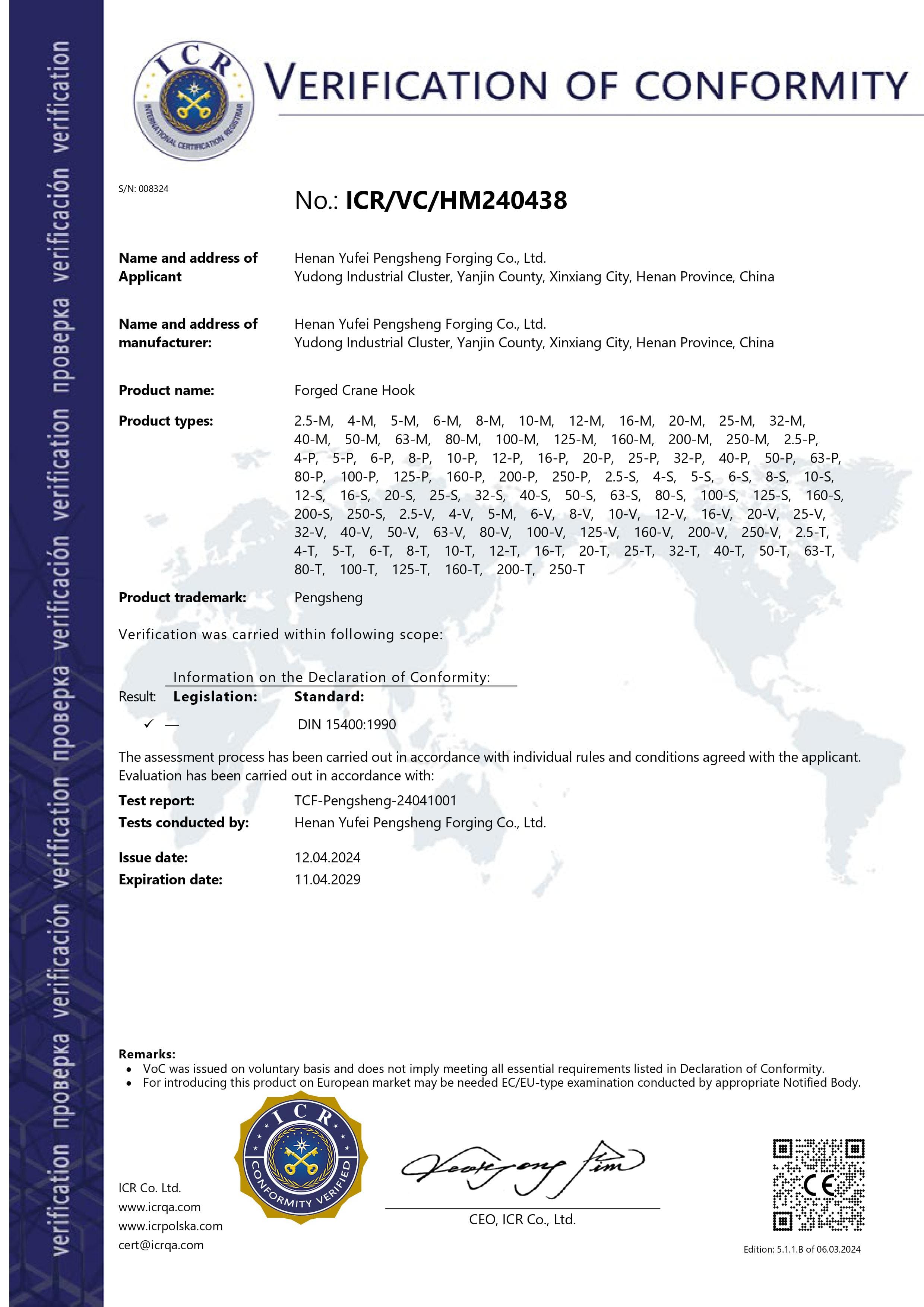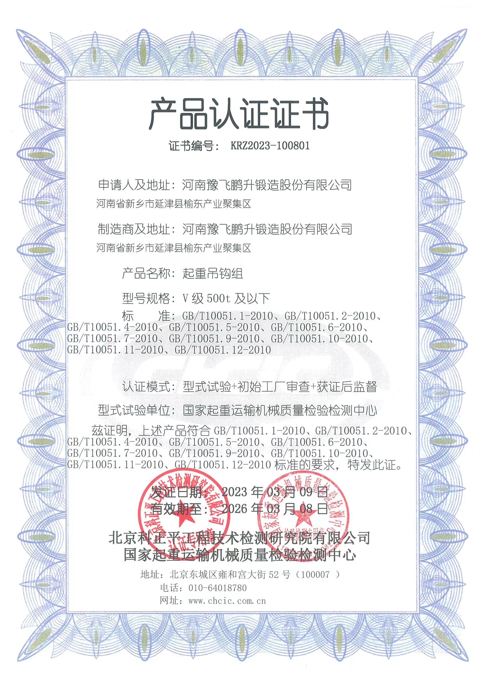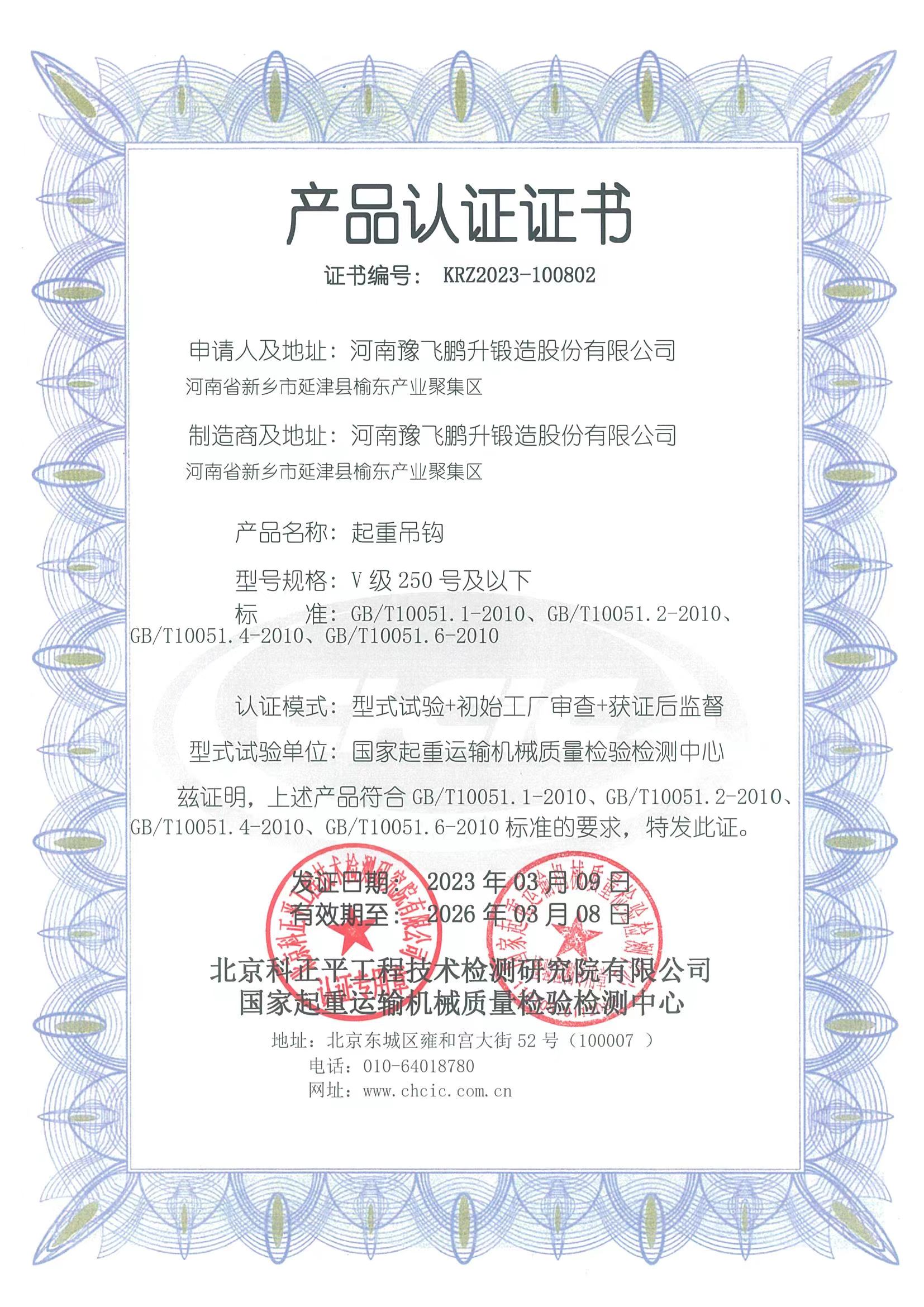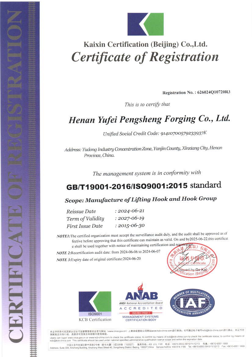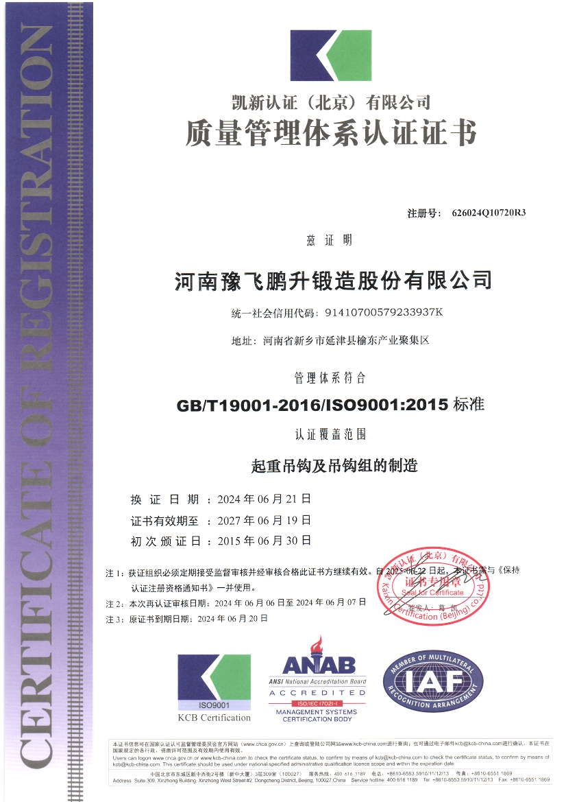 公司視產品質量如生命,質量控制環環相扣,擁有完善的檢測和探傷設備,生產工藝成熟,是廣大客戶值得信賴的合作伙伴。公司連續多年通過國家起重運輸機質量監督檢驗中心的審核認證,取得V級250號及以下吊鉤、V級500t及以下吊鉤組產品質量認可證書,通過ISO質量管理體系認證。